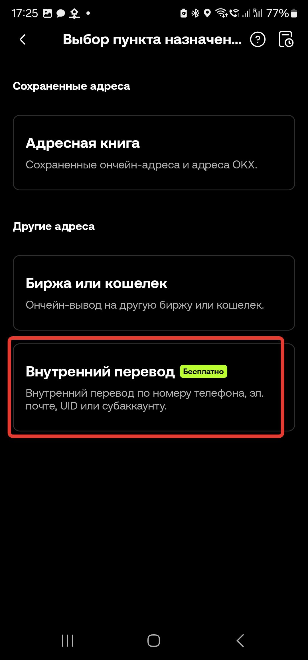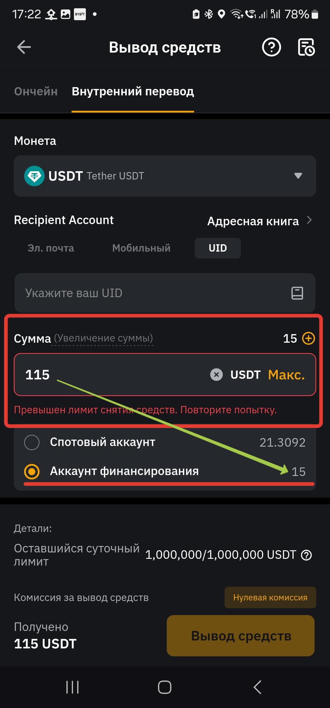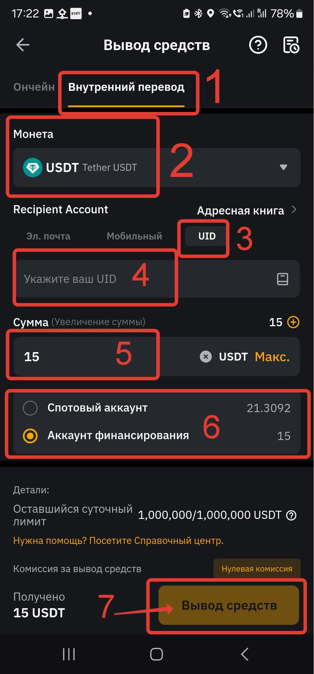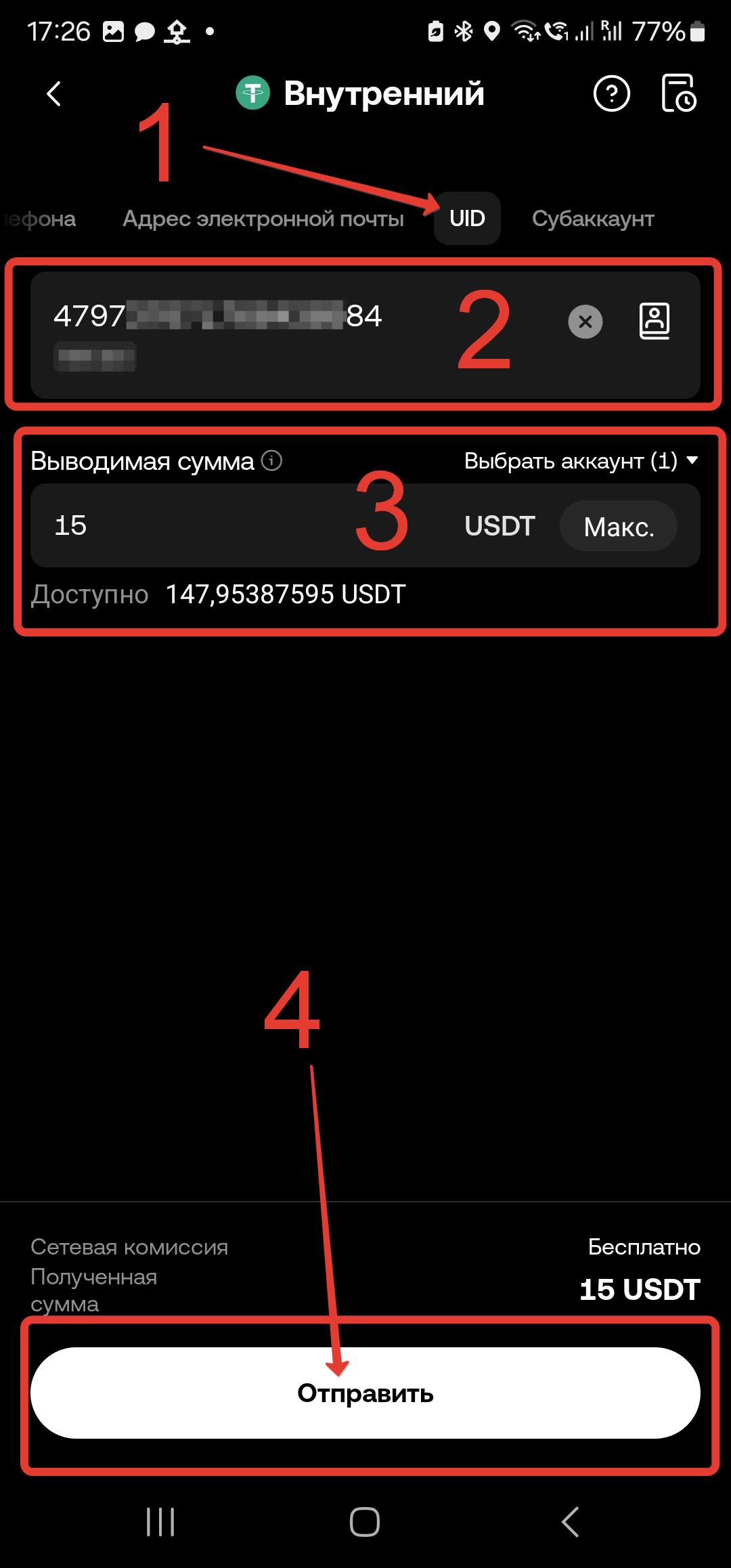 Например: Бот прислал вам, что требуется оплатить 30$ комиссии. У вас на Bybit доступно 10$, на OKX 10$ и на Gate 10$. Значит на каждой этой бирже вы делаете UID перевод по 10$ в оплату комиссии.